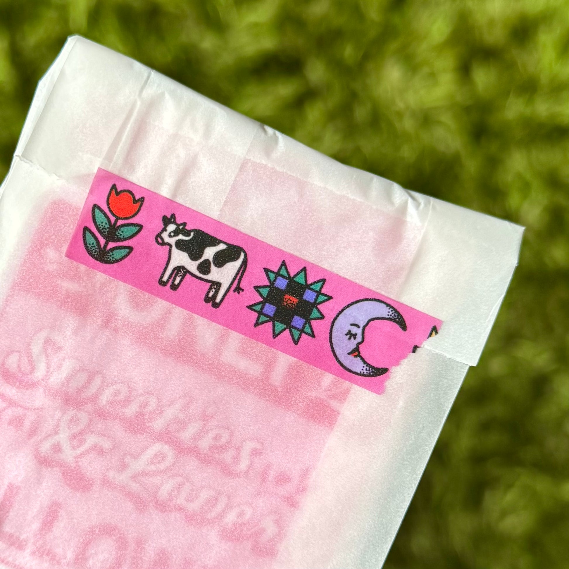 This washi tape design features quilt iconography, cows, teapots, moons, stars and flower friends!